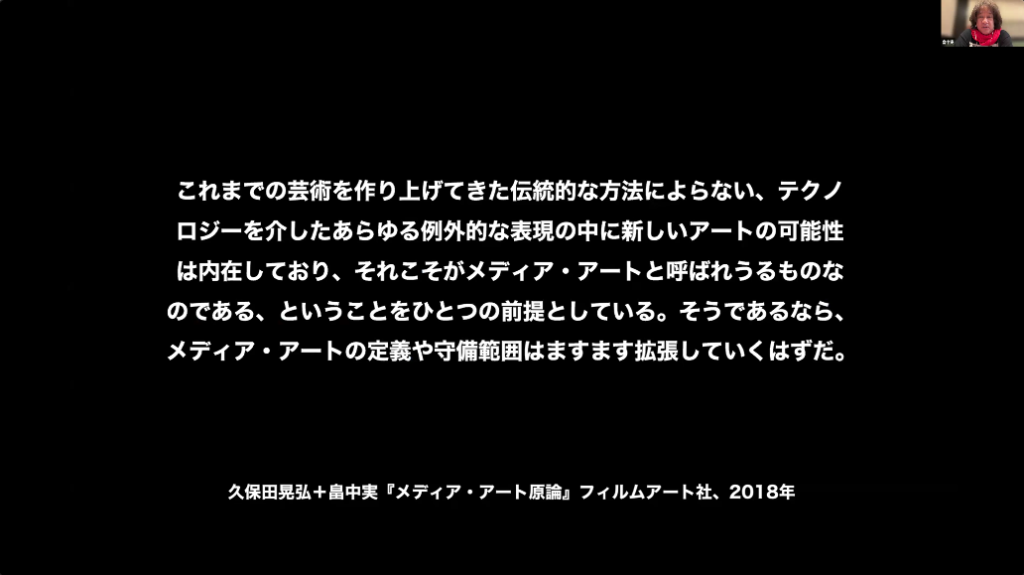 畠中 メディア・アートとは何か。ひと言ではなかなか定義しにくいんですけれども、先ほどの『メディア・アート原論』の序論では「これまでの芸術を作り上げてきた伝統的な方法によらない、テクノロジーを介したあらゆる例外的な表現」としています。