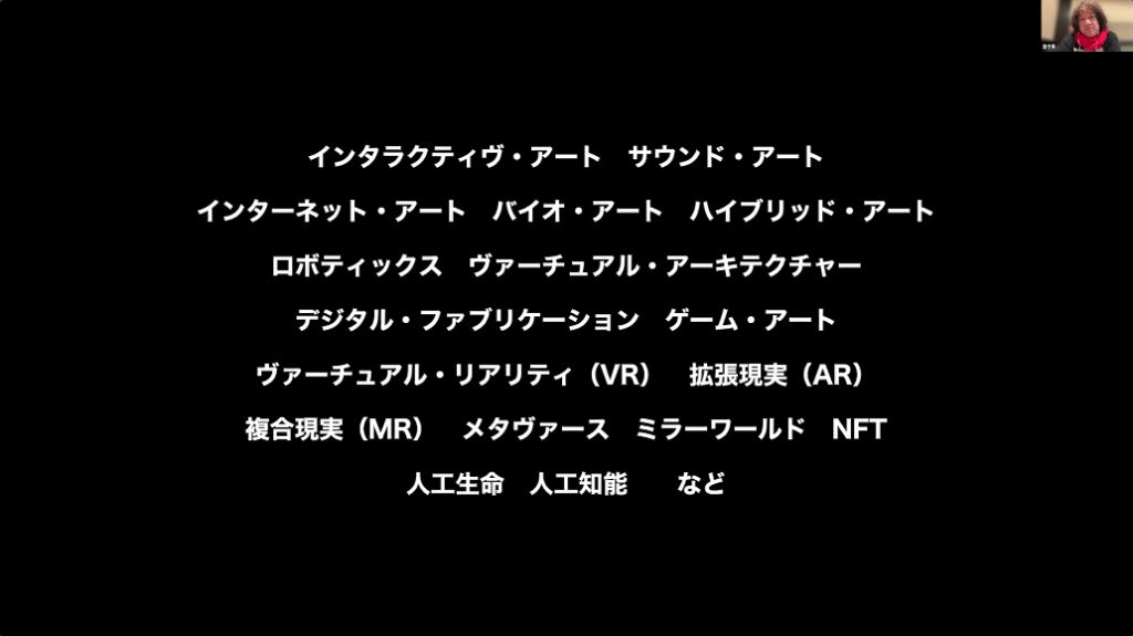 例えば絵画であっても、彫刻やダンス、小説、音楽、なんでもいいんですけれど、そういうものの中にメディア・アートがあるということですね。なので、メディア・アートと言われているものの中でも、メディア・アートじゃないものもあるかもしれないという。なので、余計に難しくなっているとも言えますね。