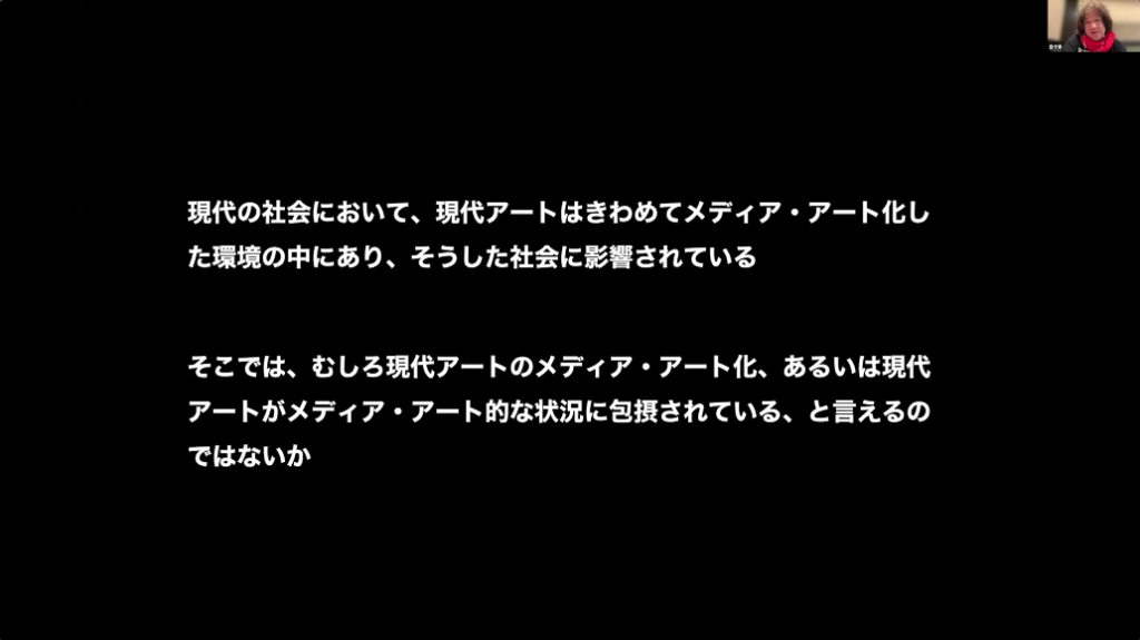 となると、メディア・アートというジャンルはいずれ現代アートに包摂されてなくなっていくのではないか、ということですね。実際にメディア・アートに先立ってヴィデオ・アートというジャンルがあったんですけれども、現在のように映像メディアが偏在化すると、そのジャンルの特異性みたいなものが薄まって、ジャンルとしては消滅してしまったと言っていいと思います。
