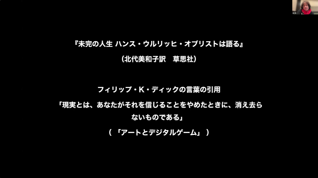 彼が自伝的に半生を記した本(※『未完の人生 ハンス・ウルリッヒ・オブリストは語る』)の中でもゲーム・アート展に触れていて、そのチャプターの締めの言葉でSF作家フィリップ・K・ディックの言葉を引用しています。「現実とは、あなたがそれを信じることをやめたときに、消え去らないものである」と、まさに今日のお話にちょうどいい一文で、びっくりしたんですけれども。