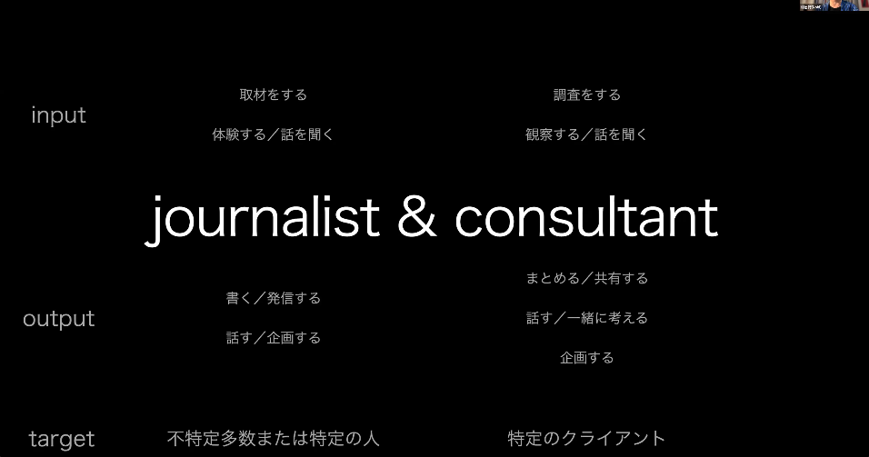 「林さんって何をやっている人ですか?」と聞かれると、最近はジャーナリストでコンサルタントです、と言っています。取材をして色んな人に話を聞いたり、他の人がしていないような体験をして、それについてメディアで書いたり、講演という形でお話ししたりする。またコンサルティングでは、特定のクライアントに対して調査をして、それについてまとめたり考えたり、ということをしています。