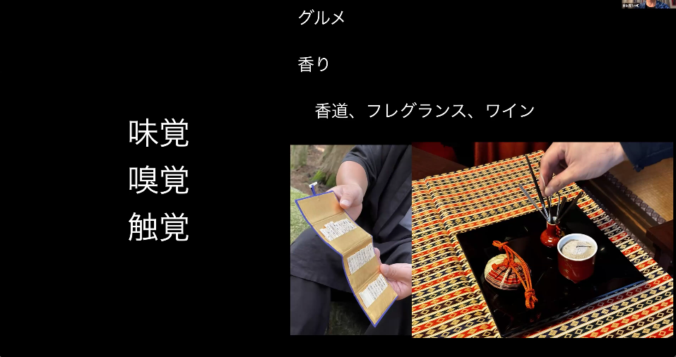 なので、僕も香道やワインといった体験をしているんですが、実は悔しいことにこういう体験が苦手で。 結局言葉にできないと記憶に定着しないんですよ。「なんか甘い系の香り」ぐらいの解像度だと、次も甘い香りがきた時に区別ができない。香りが長期記憶と結びつくという部分も確かにあるなと思いつつ、もっと言葉の解像度をあげないと短期記憶には落とし込みにくいのかな?もっと言葉以外の感覚で区別や記憶ができないかななどと考えたりしています。