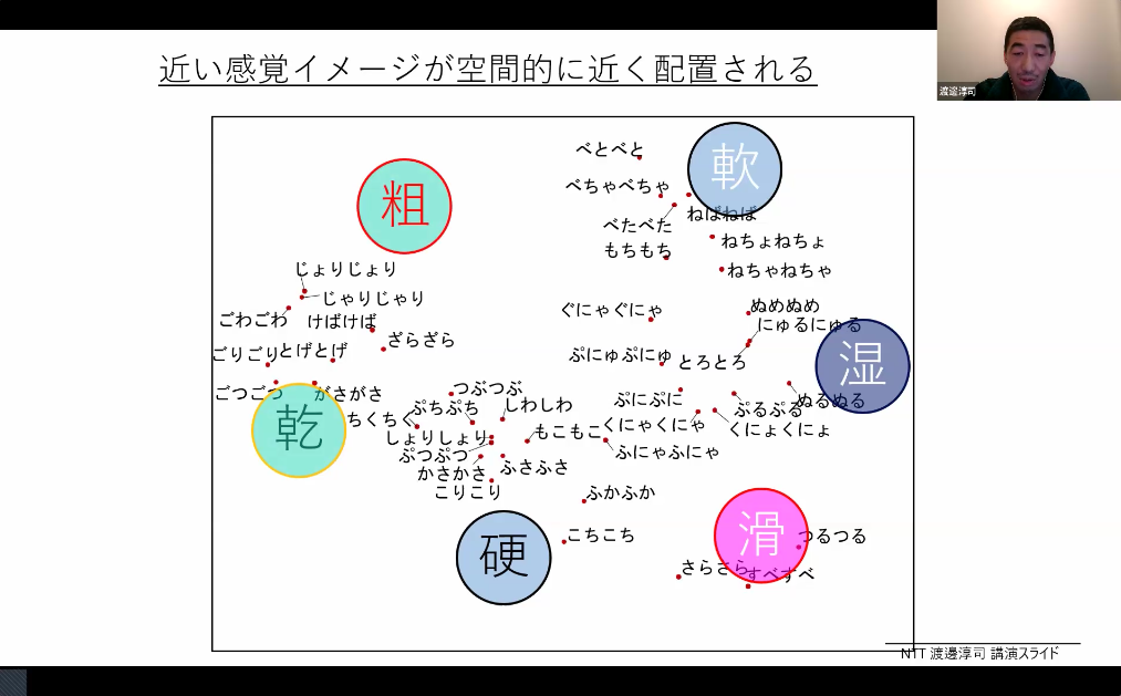 例えば、軟らかい、湿っている、滑る、のような感覚がどのような関係にあるのか、日本語話者が持っている触覚世界が現れてきます。なぜこういうことが起きるのかと考えてみると、やっぱり音の響きが関係しています。「さらさら」と「ざらざら」で、声帯や歯茎で響き方が違うんですね。大きく震えるとより粗いものに感じるとか、身体と記号を結びつける可能性があるのではと思います。
