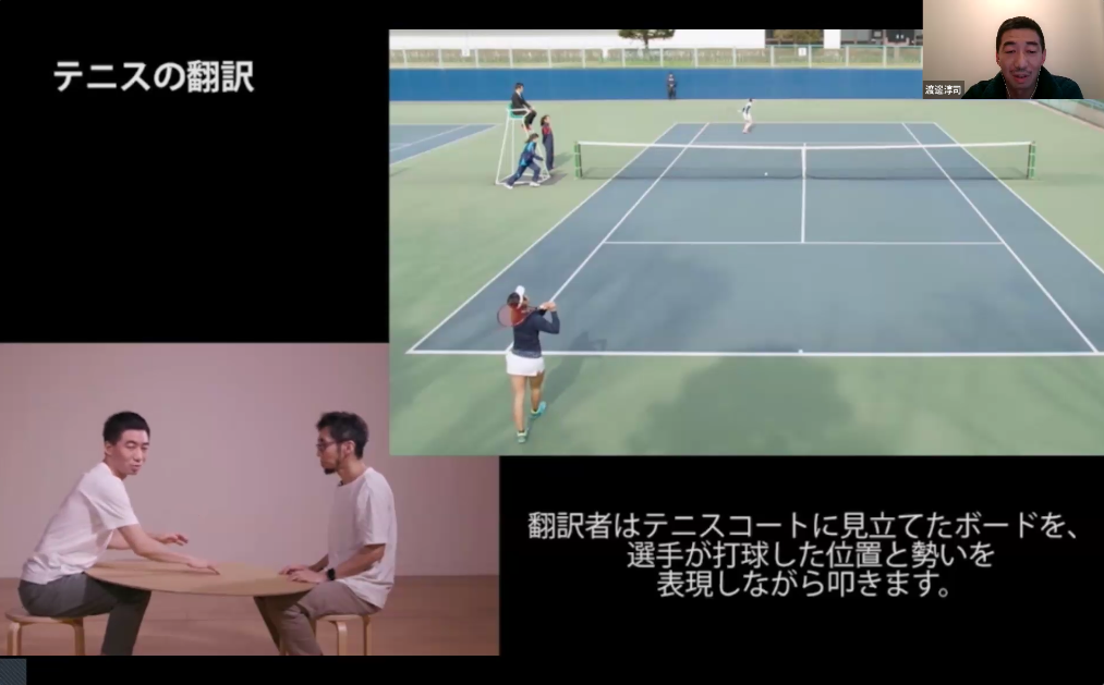こちらは私があるスポーツを見ながら、向かいにいる目の見えない方に伝えているところです。実はこれ、テニスのラリーを伝えているんですね。二人の間の段ボール板をテニスコートに見立てて、ボールが落ちたところを手で叩いて伝えている。テニスという競技を、そのまま言葉で伝えるのではなく、身体を通してその本質だと思うものを別の動きとして伝えています。伊藤亜紗さんと一緒に行ったプロジェクトで、このような伝え方を「身体的翻訳」と呼んでいます。